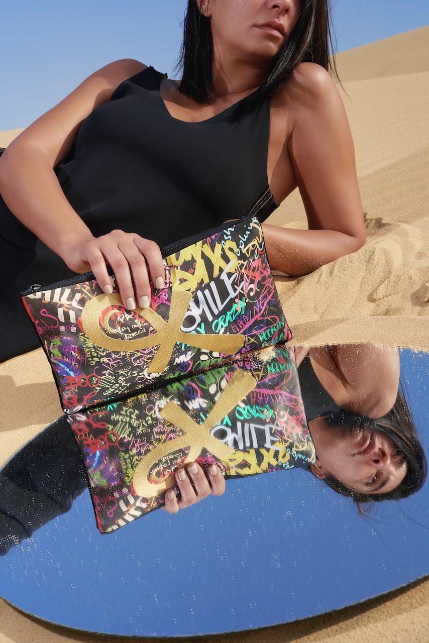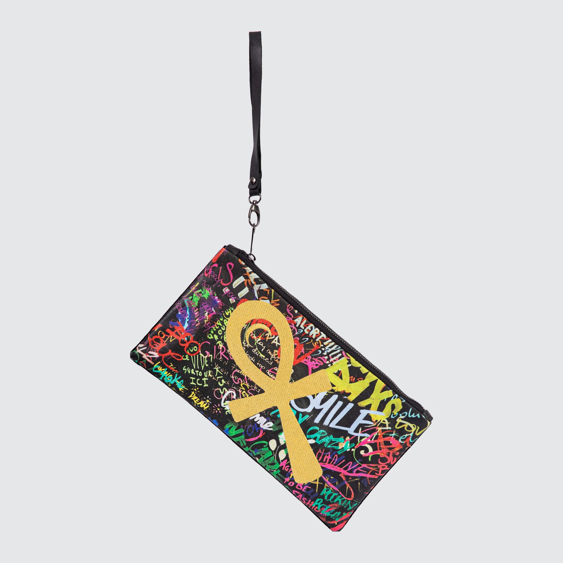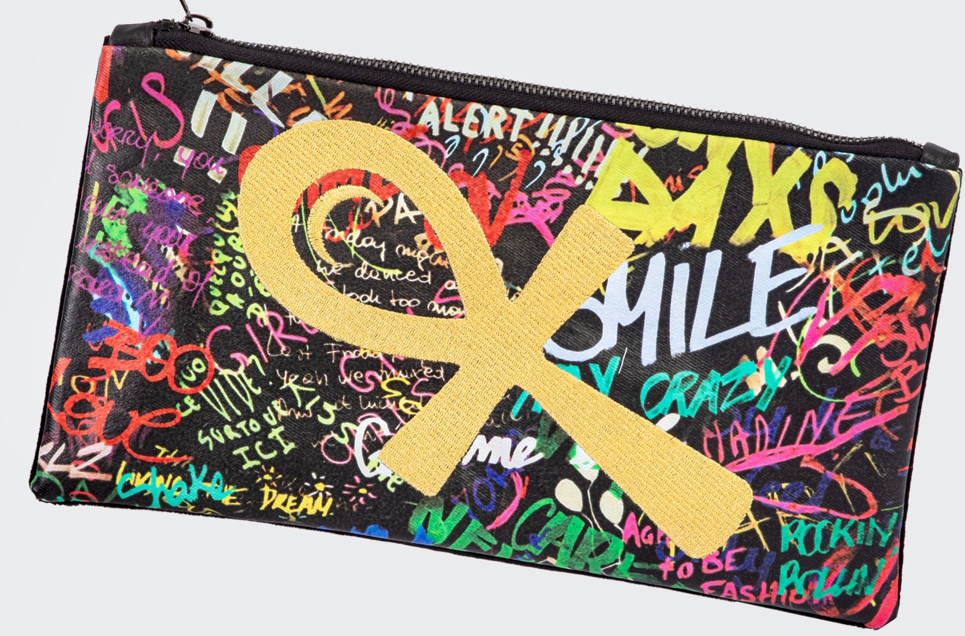 The ‘Key of Life’ clutch is made of leather-like material with detailed golden-threaded embroidery shaping the Ancient Egyptian symbol, the back is black velvet and dark red satin lining on the inside. Comes with a genuine leather wrist strap as an optional accessory. Size is 30cm width & 17cm height with an inside pocket that will for fit your phone.